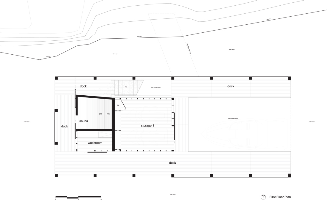 The floating house situated near a remote island surrounded by picturesque views of the Great Lakes in Canada. Sauna and boat dock are located on the first floor and a living room, kitchen, office and bedroom on the second floor.